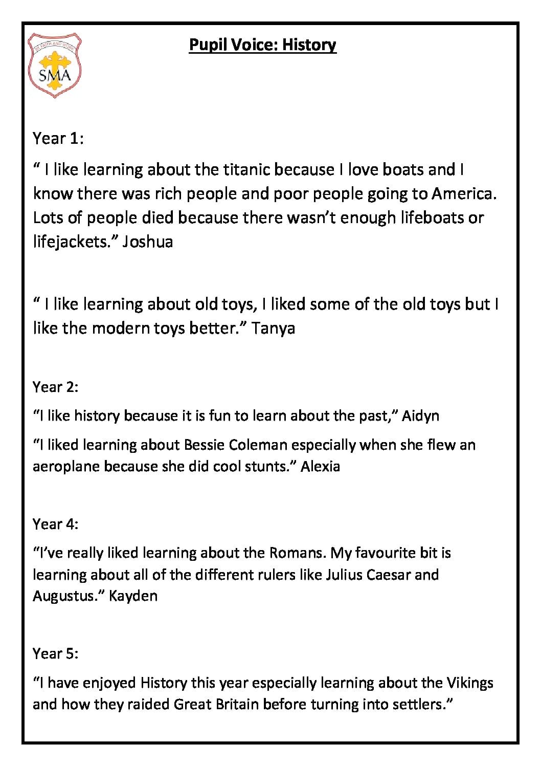 History is taught regularly throughout the year, so that children achieve depth in their learning and ensure coverage and progression of skills. Teachers have identified the key knowledge of each topic and produced knowledge organisers which are shared with the children.